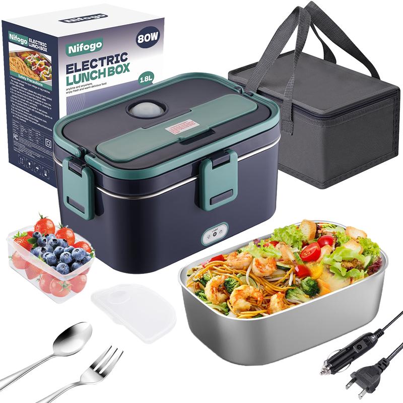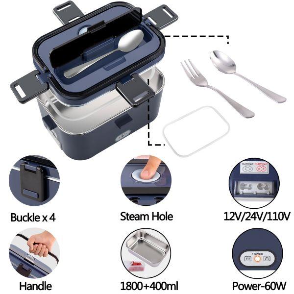Electric Lunch Box, 80W Portable Food Heater for Adults, Fast Heating Food Warmer for Car Truck Home Office 110V/12V/24V with 1.8L 304 Stainless Steel Container, Fork Spoon and Bag